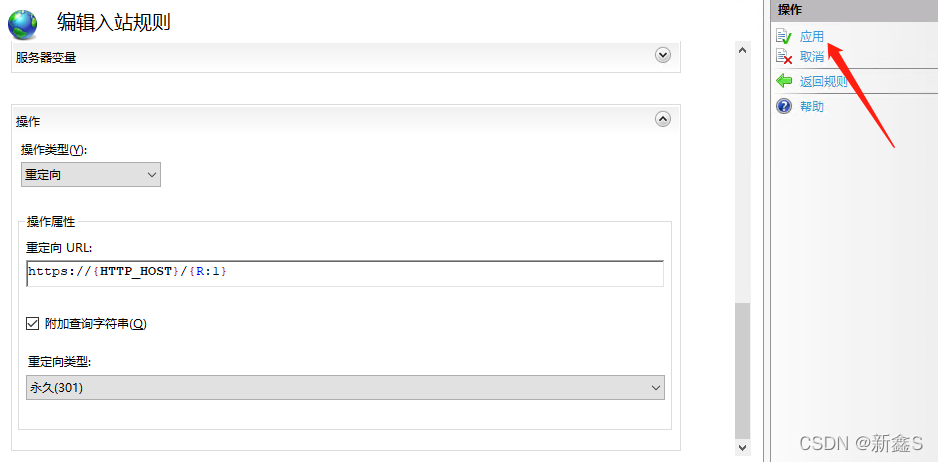操作類型為重定向,重定向URL為https://{HTTP_HOST}/{R:1},勾選附加查詢字符串,重定向類型為永久(301)。
