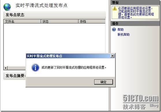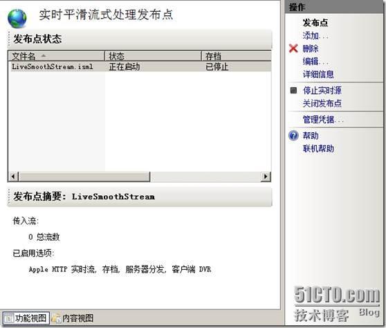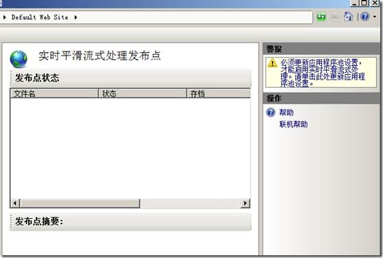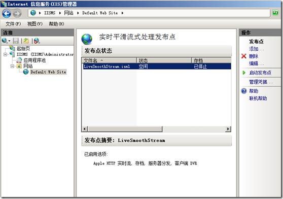 當(dāng)從發(fā)布點(diǎn)開始接受Expression Encoder Pro編輯器發(fā)來的數(shù)據(jù)之后,它的狀態(tài)將變成State。需要在IIS 管理器中刷新Live Smooth Streaming發(fā)布點(diǎn)頁面,才能看到這個(gè)狀態(tài)的改變。