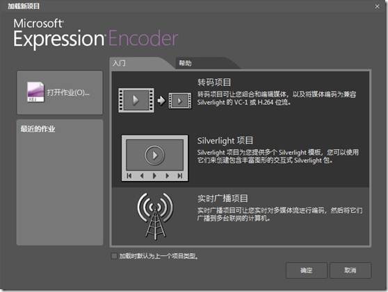 三、配置Expression Encoder Pro視頻采集計(jì)算機(jī)1、 在視頻采集計(jì)算機(jī)上打開Microsoft Expression Encoder Pro 4.0,在 “加載新項(xiàng)目”對(duì)話框選擇“實(shí)時(shí)廣播項(xiàng)目”。