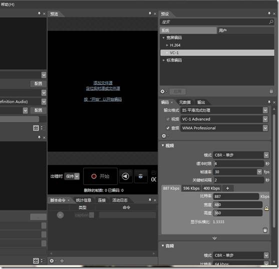3、 點(diǎn)擊右側(cè)“預(yù)設(shè)”面板,為L(zhǎng)ive Smooth Streaming直播方案選擇可調(diào)整的編碼速率和編碼格式。在“編碼”選項(xiàng)卡中選擇“IIS 平滑流式處理”??梢宰远x輸出格式、視頻、音頻格式。
