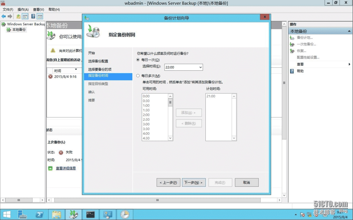 5、指定備份時間,這里只能選擇每天一次,或每天多次,暫時選擇每日一次,待備份向導設置好,在后面會進行周期更改設置。(可以備份到共享網絡文件夾)