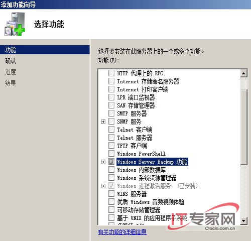 1、安裝Windows Server BackupWindows Server Backup工具已經包含在所有版本的Windows Server 2008中,但默認狀態下它并沒有被安裝。要安裝Windows Server Backup工具,我們可通過服務器管理器來完成。在服務器管理器中從左側窗格選擇“功能”節點,然后單擊右側的“添加功能”鏈接,隨后會打開“添加功能向導”。在“選擇功能”界面中,選擇“Windows Server Backup”(建議同時選擇Windows Recovery Disc,該工具是還原工具)。在選擇Windows Server Backup功能時,Windows Server Backup和命令行工具選項都將被選中。單擊“下一步”,然后單擊“安裝”按鈕。在向導安裝完這些功能后,單擊“關閉”按鈕即可。至此,Windows Server Backup功能就成了管理工具鋼菜單下的一個選項,同時在“所有程序”→“維護”菜單下還將能看到“創建恢復盤”選項。(圖1)