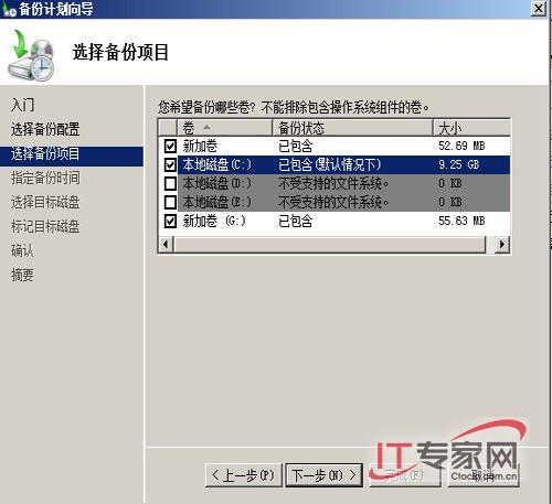 運行Windows Server Backup工具,在其窗口的操作窗格或“操作”菜單中單擊“備份計劃”就會啟動備份計劃向導。在掃描完所有可用磁盤后,Windows Server Backup會啟動備份計劃向導,單擊“下一步”。在“選擇備份配置”界面中需要注意“整個服務器”單選按鈕下列出的備份大小,這時用于備份服務器數據、應用程序已經系統狀態所需要的存儲空間的大小。如果希望備份服務器上所有的卷,選擇“整個服務器”單選按鈕即可。如果要備份服務器上特定的卷,選中“自定義”單選按鈕,單擊“下一步”進入設置界面。此時會在“選擇備份項目”界面中顯示當前服務器所有的卷,在此我們選擇需要備份卷,并反選不需要備份的卷對于的選項。需要注意的是,只有NTFS格式的分區才會顯示出來,同時包含了引導文件、操作系統文件或應用程序的卷默認會被選中,并且不可取消。(圖3)