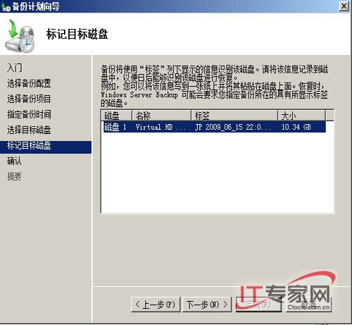 依據向導進入“標記目標磁盤”界面,所選的磁盤都會列出來。另外還有不同的標簽顯示磁盤的類型、服務器的名稱和當前的日期與可用空間的大小。如果希望從這些磁盤上的備份中恢復,那么就需要通過這些信息選擇磁盤。因此,筆者建議一定要將這些信息記錄下來,對于外部磁盤,我們可將包含這些信息的標簽直接貼到硬盤上。在“確認”界面中,在復查信息無誤后,單擊“完成”就會執行目標磁盤的格式化。(圖6)