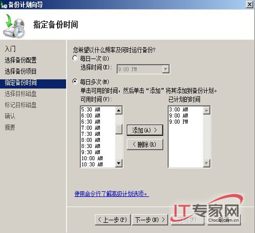 依據向導進入“指定備份時間”界面,在此我們可以決定備份的頻率和備份的時間。如果希望在每天的特定時間執行備份,需選中“每日一次”單選按鈕,然后選擇每天進行備份的開始時間。如果希望每臺執行多出備份,需選中“每日多此”單選按鈕,然后從“可用時間”列表框中選擇一個開始時間,并單擊“添加”按鈕將其加入到“已計劃的時間”列表框中,對于每個希望添加的時間,重復上面的操作即可。(圖4)