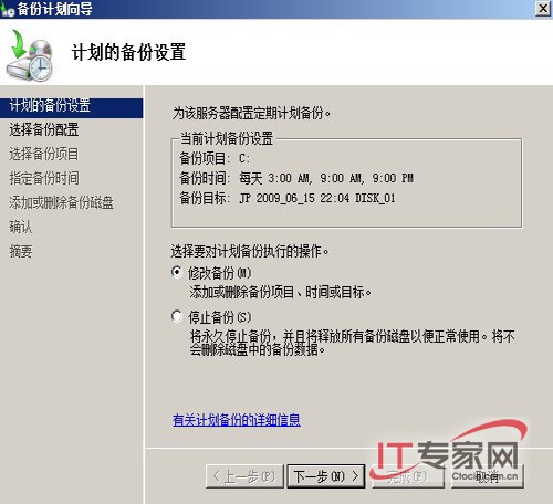依據向導進入“計劃的備份設置”界面,在該界面中有兩個單選按鈕,如果希望添加或刪除備份項目、時間或目標,只需選中“修改備份”單選按鈕。如果希望停止計劃備份的運行,單擊“停止備份”單選按鈕。需要說明的是,停止備份會將磁盤空間釋放以供常規使用,但存在其中的備份并不會被刪除,在進行數據恢復時依然可以使用。最后,根據向導完成備份計劃的創建。(圖7)