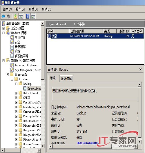 其二,不管什么時候執行Windows Server Backup備份服務,該程序都會將相關的事件寫入到Windows事件日志中。有關日志可以在“應用程序和服務日志\Microsof\Windows\Backup\Operational”節點下看到。通過查看Operational日志,我們可以快速了解備份從什么時候開始,什么時候結束,已經失敗的原因。例如是由其他管理員取消,或者是否是因為備份目標上的可以空間不足。通過備份的開始時間和完成時間計算,我們還可以知道備份進行了多長時間等等。(圖8)