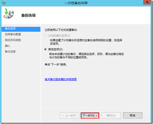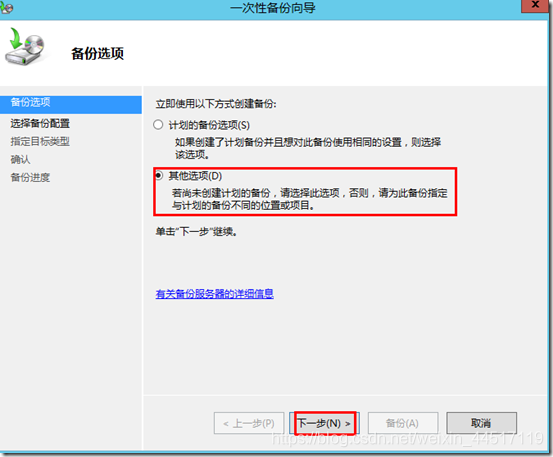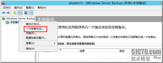 1.打開Windows Server Backup,右擊“本地備份”后選擇“一次性備份”。在打開的向?qū)е兄苯?下一步".由于是一次性的備份,所以計(jì)劃的備份時(shí)不可選的。