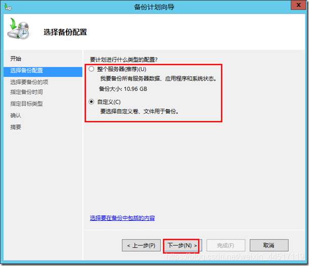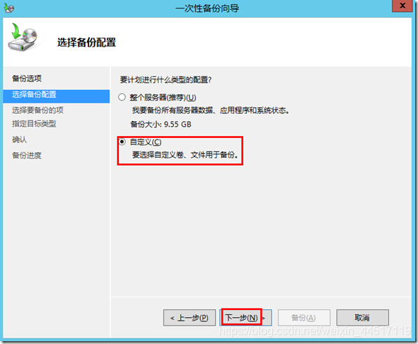 2.我們只需對(duì)特定的文件進(jìn)行備份,選擇“自定義”。如果選擇整個(gè)服務(wù)器,將備份所有服務(wù)器數(shù)據(jù)。