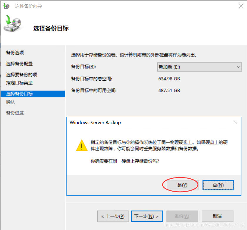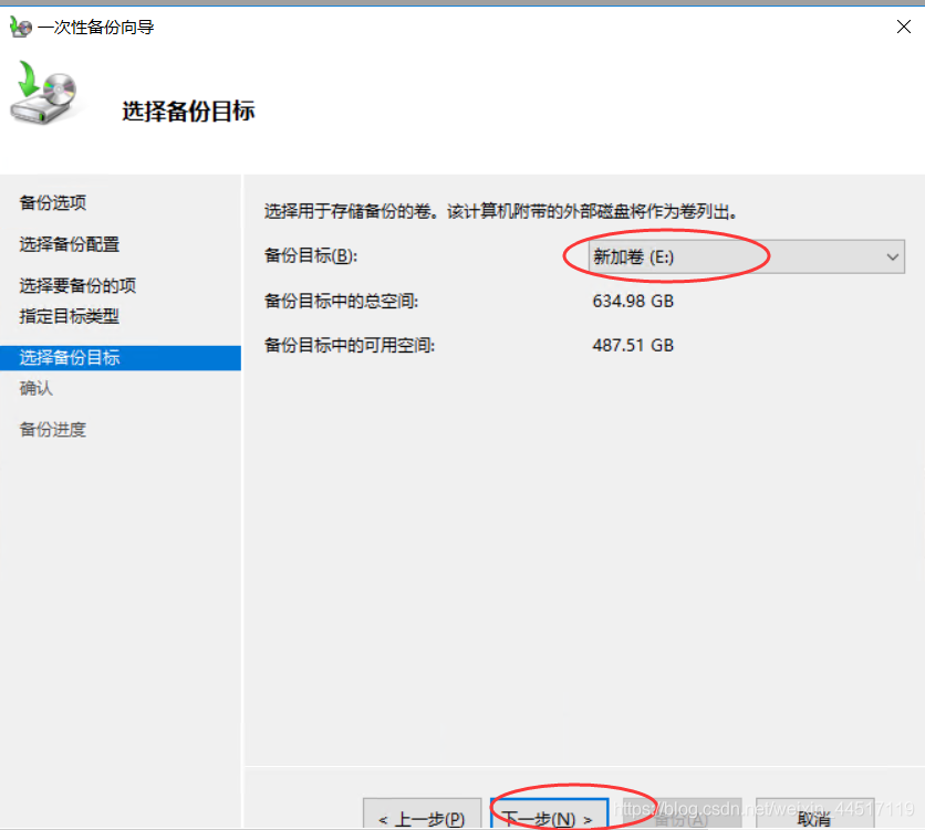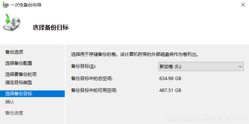 5.選擇備份存儲(chǔ)目標(biāo)。注意:無法選擇需要備份文件所在的分區(qū),強(qiáng)烈建議生產(chǎn)環(huán)境不要選擇系統(tǒng)盤作為備份目標(biāo)。由于實(shí)驗(yàn)機(jī)器上只有C、E兩個(gè)分區(qū),所以只能選E盤。