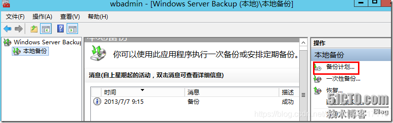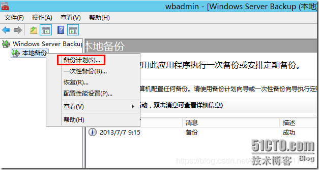 1.在Windows Server Backup控制臺(tái),右擊“本地備份”,選擇“備份計(jì)劃”。