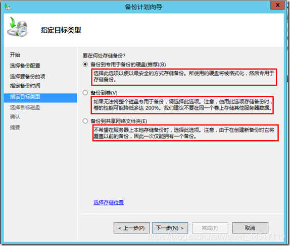 5.參考各個(gè)選項(xiàng)的說明,根據(jù)企業(yè)環(huán)境選擇相應(yīng)的存儲(chǔ)。這里作為演示選擇“備份到卷”(生產(chǎn)環(huán)境,請(qǐng)慎重選擇此項(xiàng),卷的性能會(huì)降低)