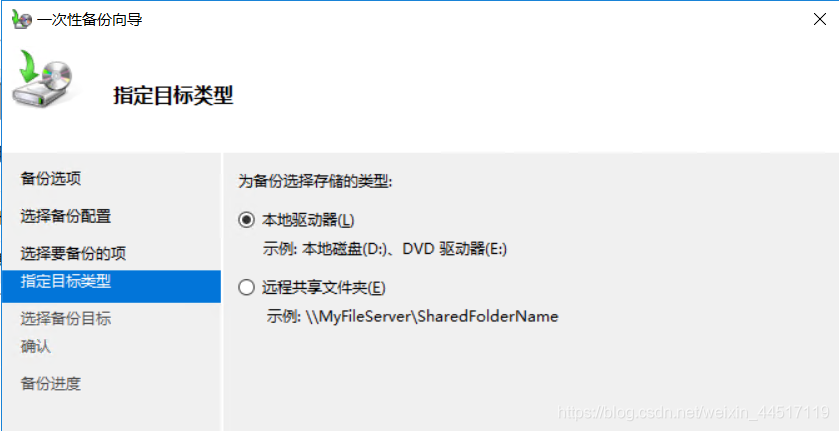 4.選擇備份文件存放路徑。可以選擇本地存儲(chǔ)或遠(yuǎn)程共享文件夾,不支持磁帶驅(qū)動(dòng)器。