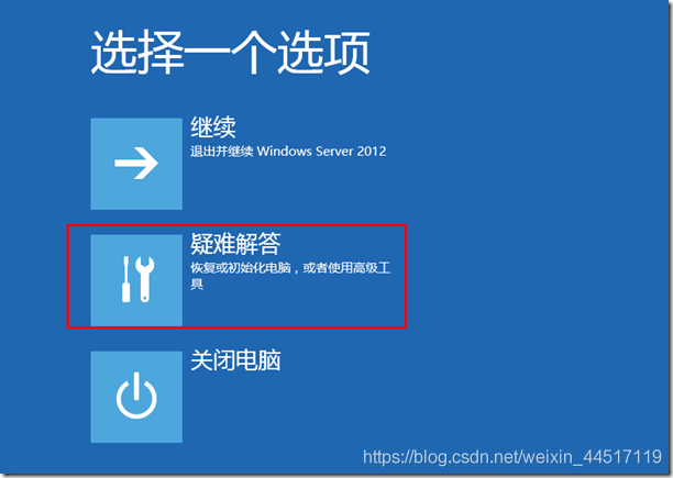 5.Windows將關(guān)閉。在出現(xiàn)選擇一個(gè)選項(xiàng)屏幕時(shí),選擇疑難解答
