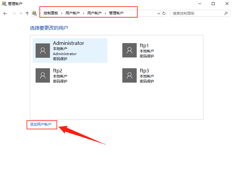 4. 配置遠程桌面服務4.1 創建遠程訪問賬戶(1)在FTP服務器上打開【控制面板】——>【用戶賬戶】——>【用戶賬戶】——>【管理其他賬戶】——>【添加用戶賬戶】。