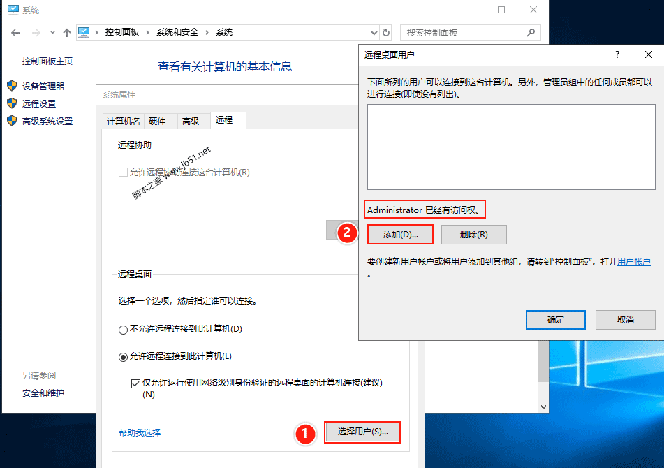 (2)返回【系統屬性】,點擊【選擇用戶】,在彈出的【遠程桌面用戶】提示框中,Administrator默認已有訪問權。點擊【添加】。