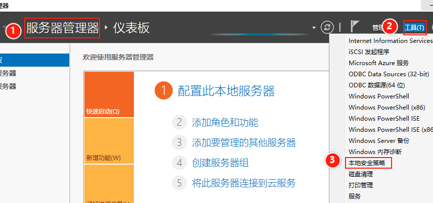 (1)打開【服務器管理器】,點擊【工具】——>【本地安全策略】。