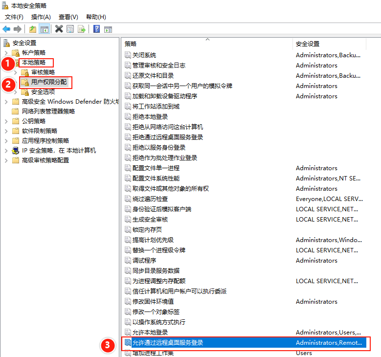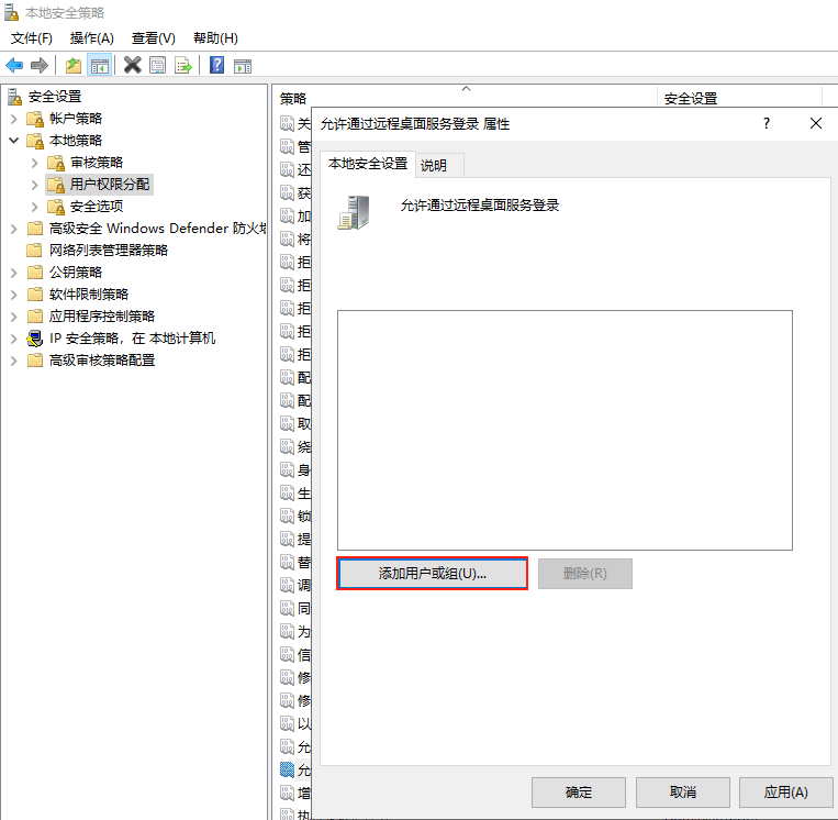 (2)依次展開【本地策略】——>【用戶權限分配】,在右側窗口中雙擊【允許通過遠程桌面服務登錄】。