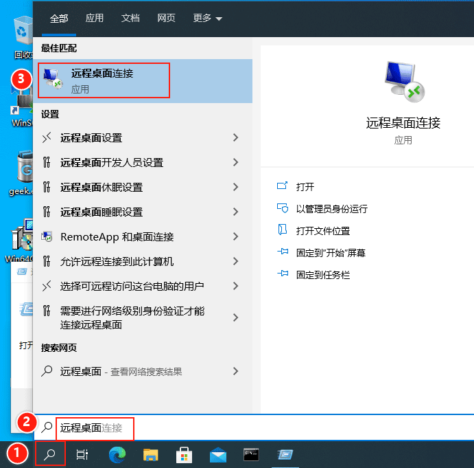 點擊【搜索】圖標,輸入:遠程桌面,在最佳匹配中選擇【遠程桌面連接】。