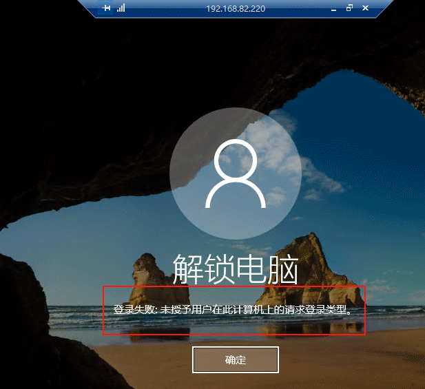 (5)進入遠程桌面窗口,但是提示:登錄失?。簽槭谟栌脩粼诖擞嬎銠C的請求登錄類型。說明 administrator 的遠程登錄權限禁用設置成功。