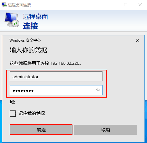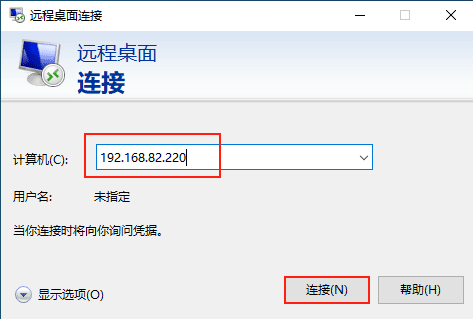 (2)在彈出的【遠程桌面連接】認證窗口中輸入被遠程訪問的計算機的IP地址:192.168.82.220,點擊【連接】。