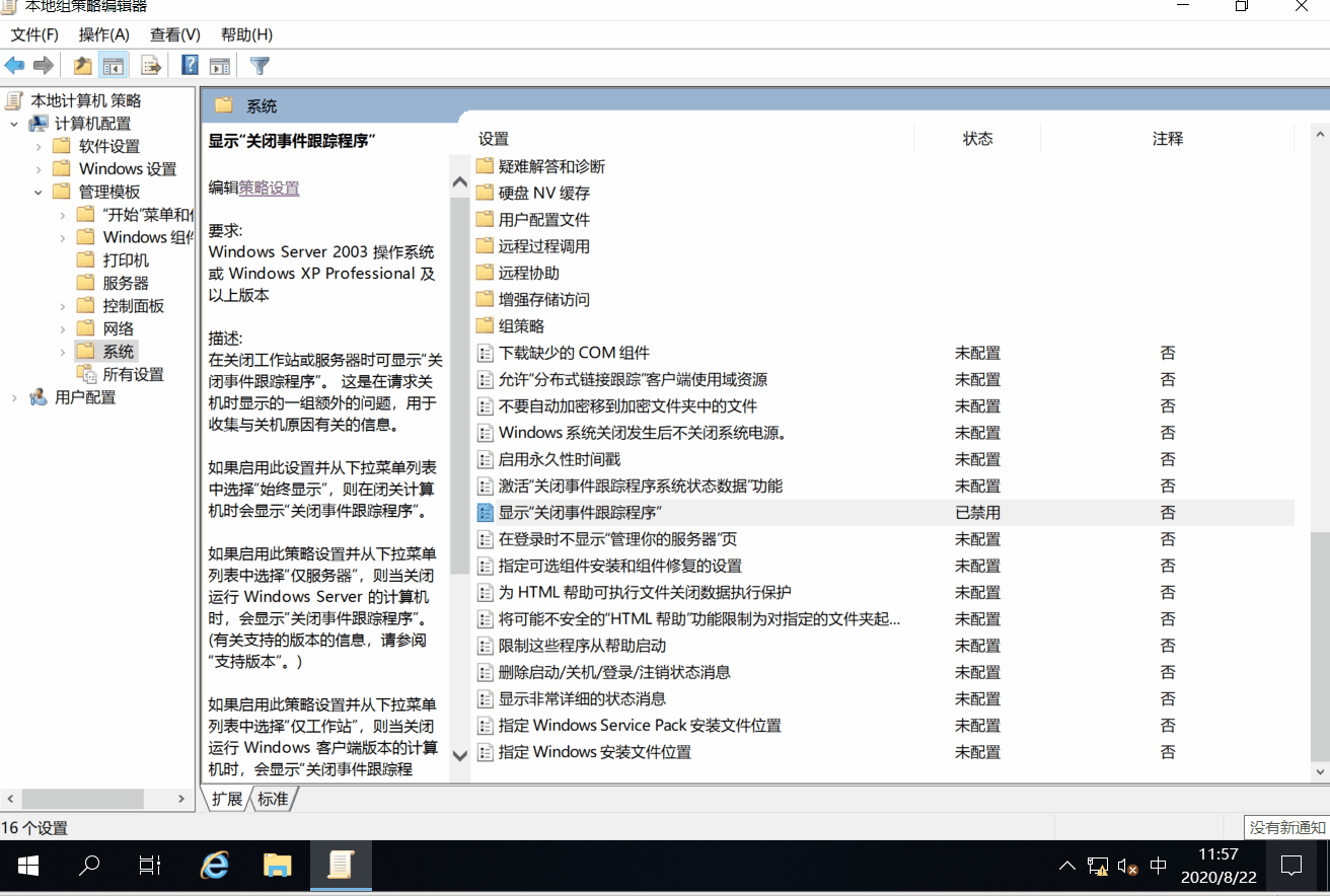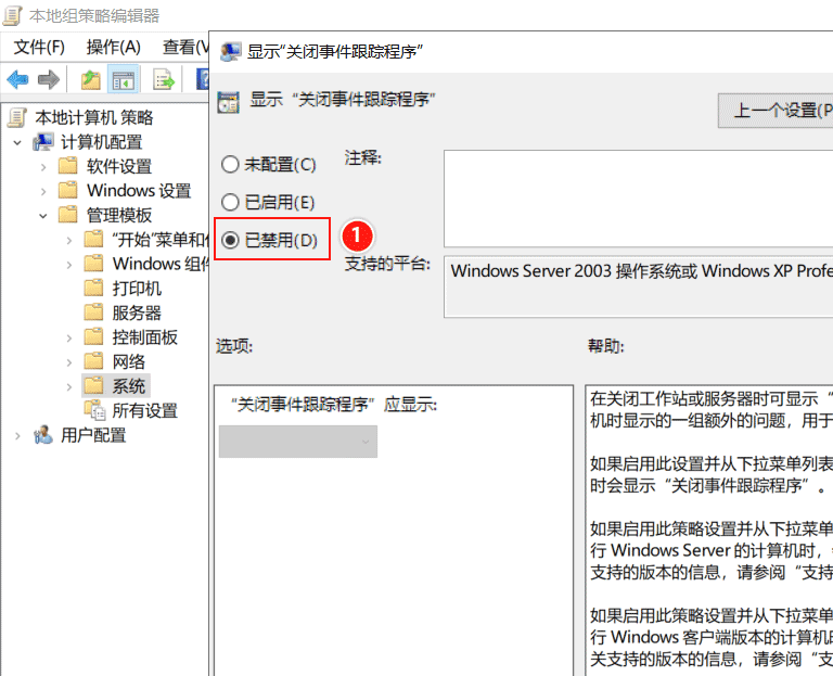 (2)禁用Windows Server 2019服務(wù)器的【關(guān)閉事件追蹤程序】。