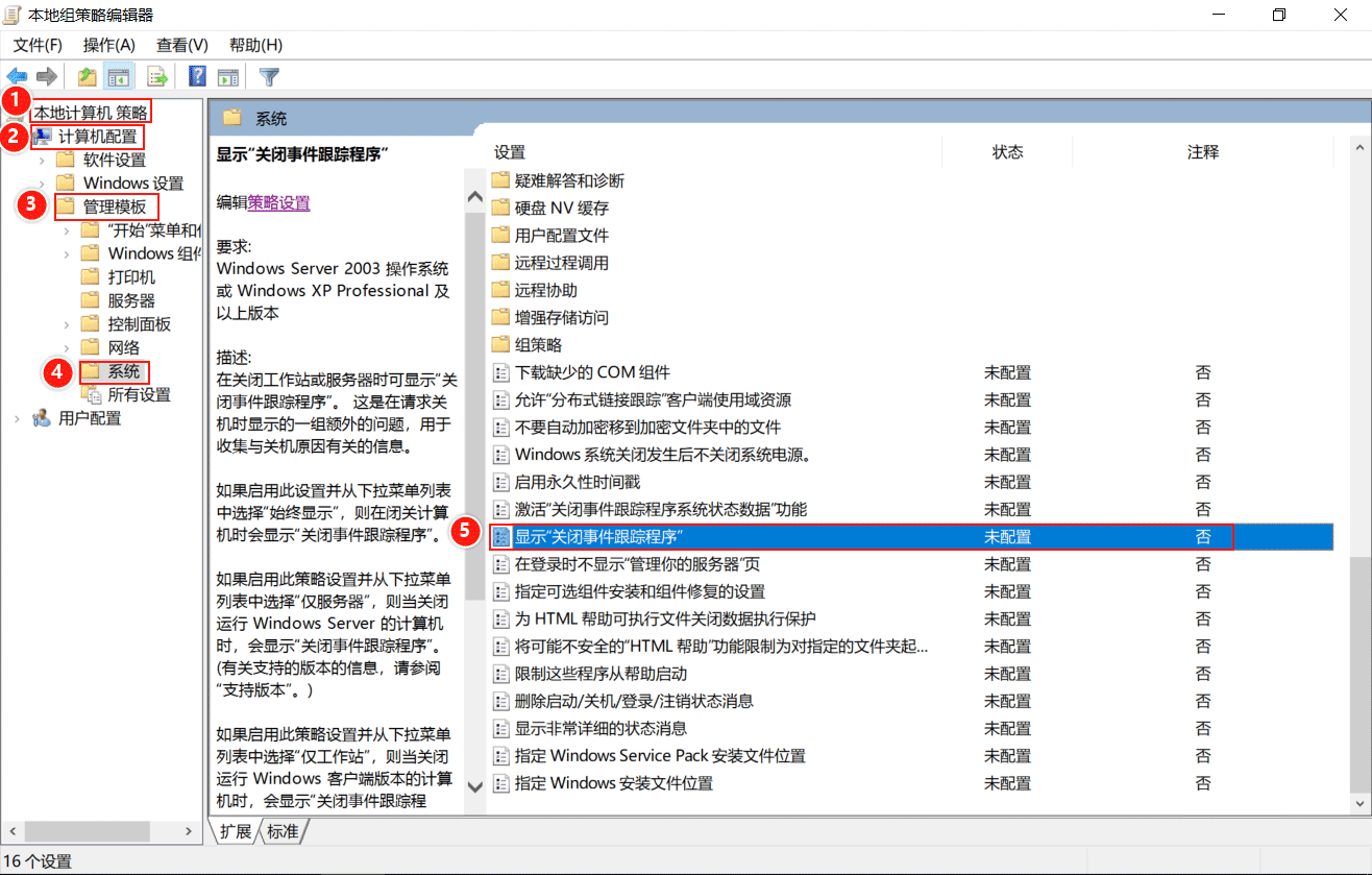 Windows Server 2019 服務(wù)器的關(guān)閉事件追蹤程序要求用戶在關(guān)機時提供關(guān)機原因。如果用戶不希望每次關(guān)機時都需要提供關(guān)機原因,可以通過本地組策略設(shè)置,來禁用本地關(guān)閉事件追蹤程序。