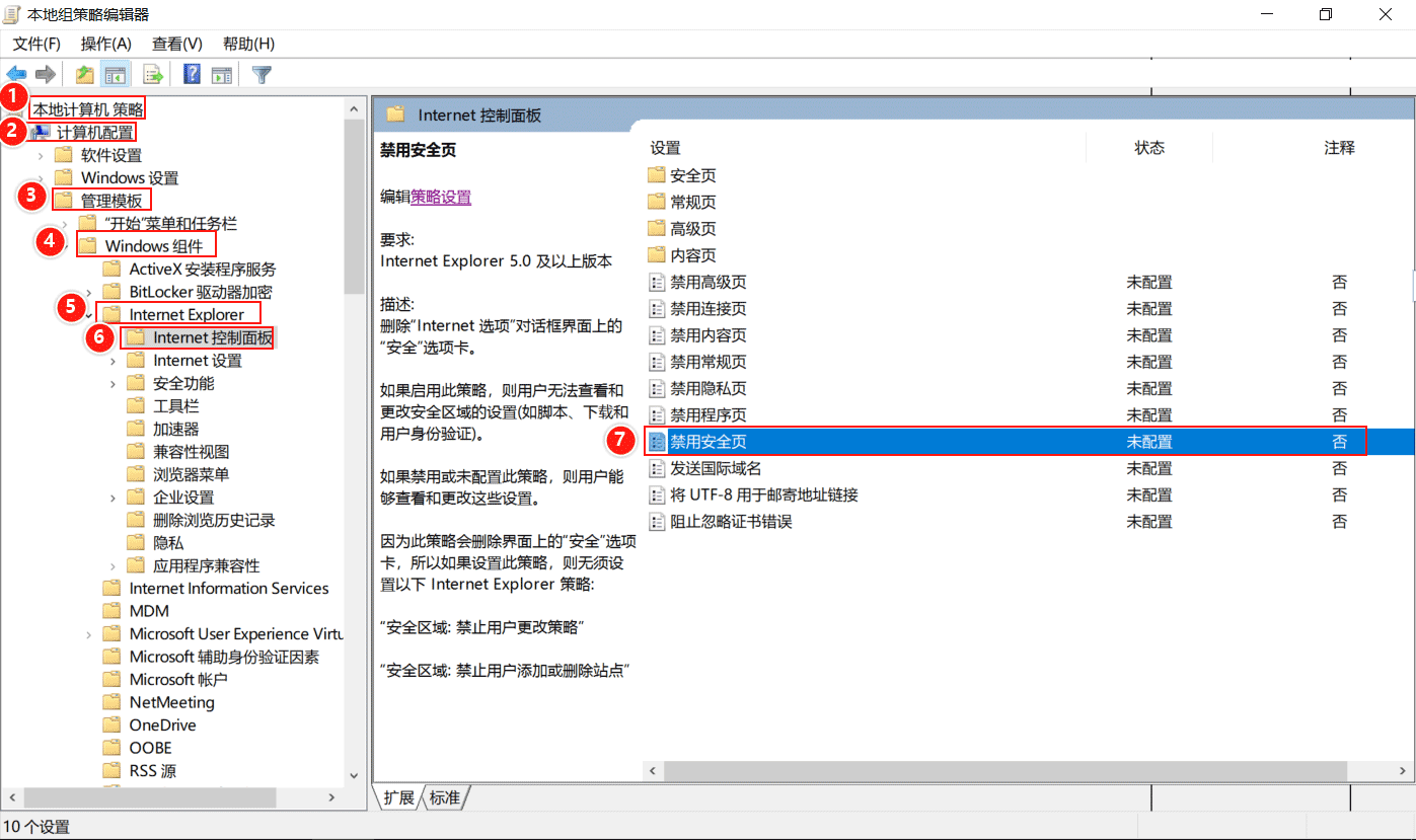 打開本地組策略編輯器,依次展開【本地計算機策略】——>【計算機配置】——>【管理模版】——>【W(wǎng)indows組件】——>【互聯(lián)網(wǎng) Explorer】——>【互聯(lián)網(wǎng)控制面板】,找到【禁用安全頁】,雙擊打開。