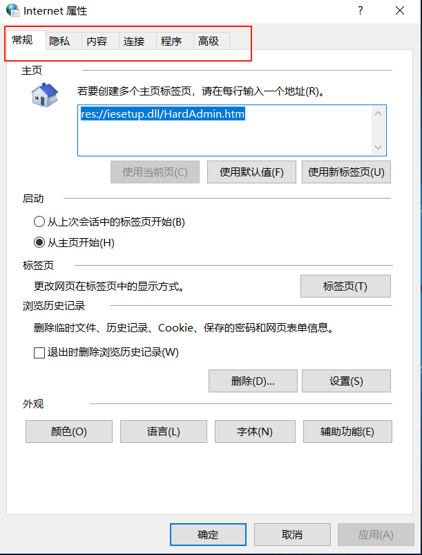 打開【控制面板】——>【網(wǎng)絡(luò)和互聯(lián)網(wǎng)】,雙擊【互聯(lián)網(wǎng)選項】,彈出的【互聯(lián)網(wǎng)屬性】對話框中正常包 含【常規(guī)】,【安全】,【隱私】、【內(nèi)容】,【連接】,【程序】,【高級】7個選項卡。