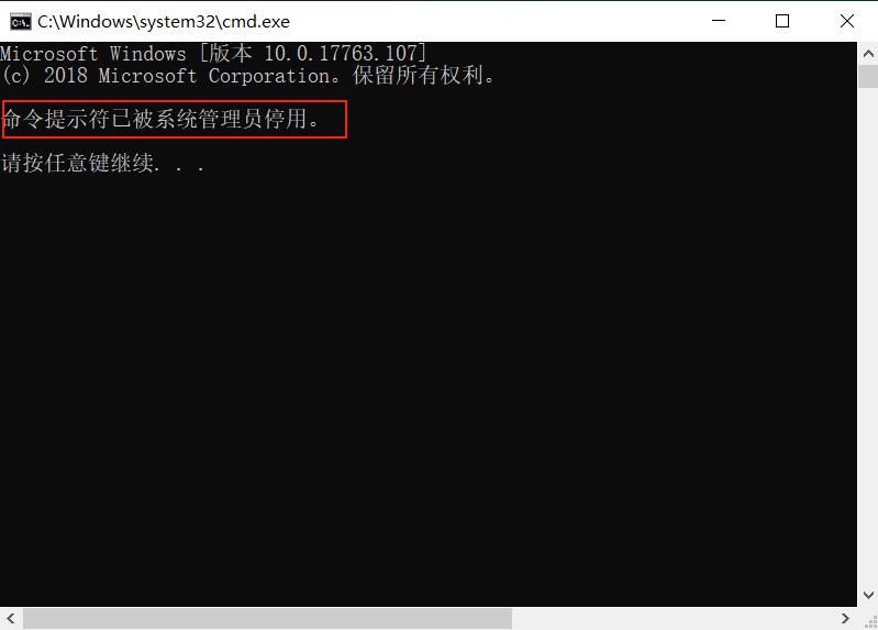 再次打開cmd時,cmd.exe 提示:命令提示符已被系統(tǒng)管理員停用。