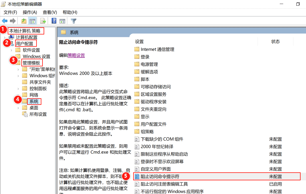 (4)禁止本機用戶使用命令提示符。
