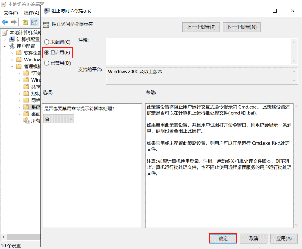 該選項默認開啟,所以選擇【已禁用】,點擊【確認】。