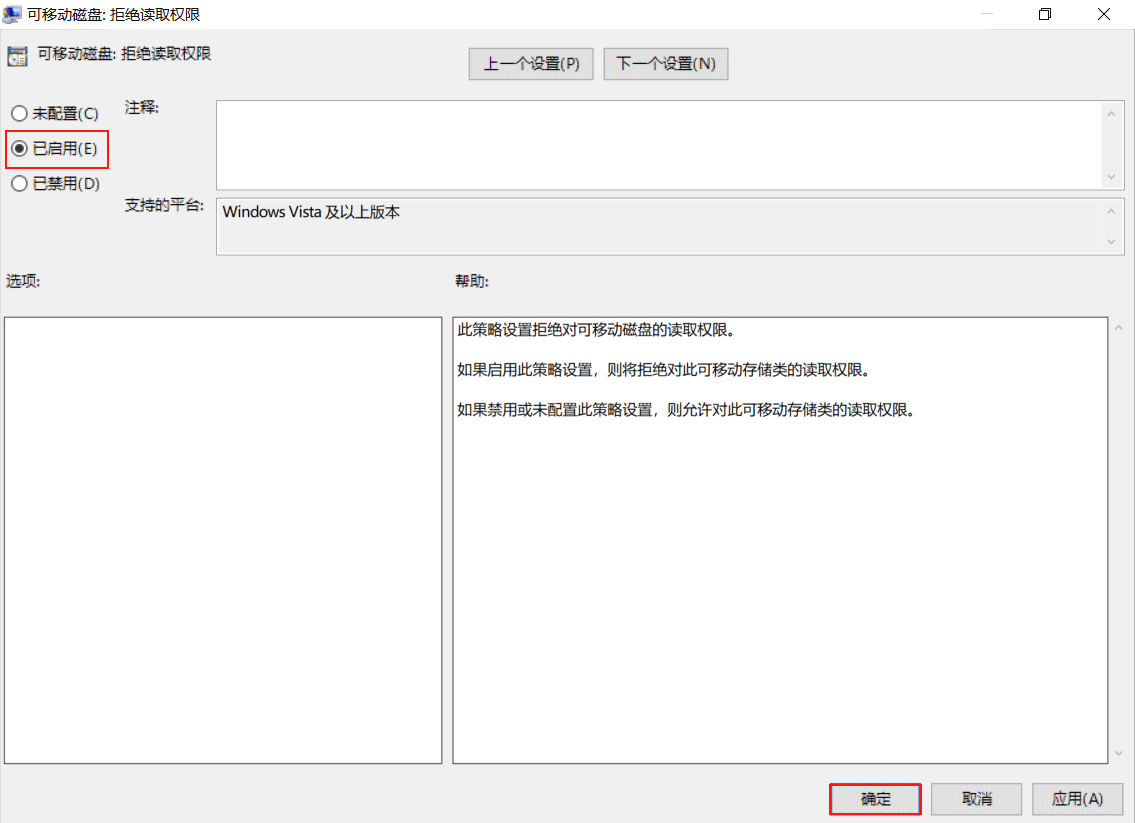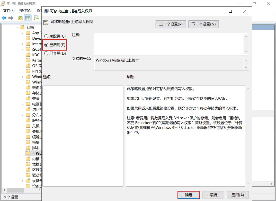找到【可移動磁盤:拒絕讀取權(quán)限】,雙擊打開,選擇【已啟用】,點擊【確認】。