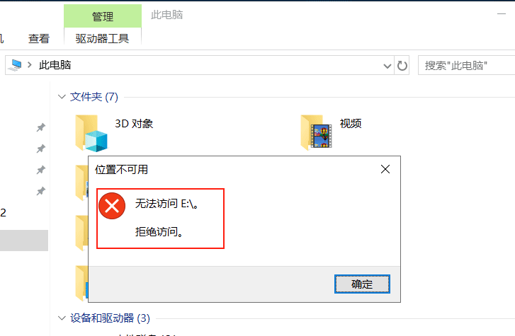 將可移動硬盤連接到服務(wù)器中,雙擊可移動硬盤,系統(tǒng)彈出告警對話框:拒絕訪問。