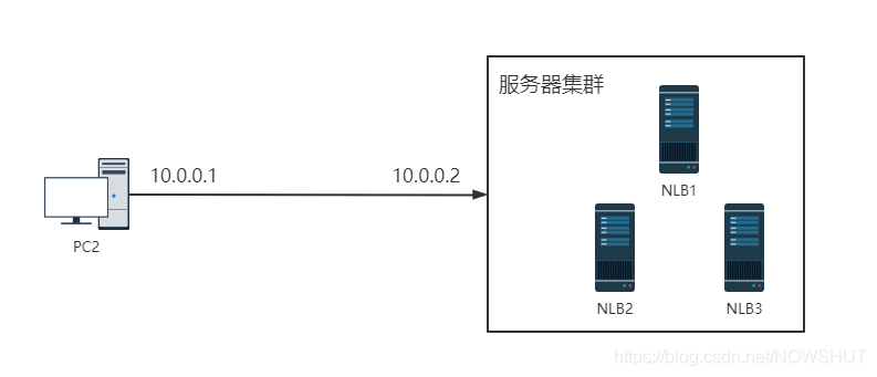 左側(cè)為客戶端電腦PC2,IP地址為10.0.0.2。PC2通過10.0.0.2訪問服務(wù)器集群NLB1-3提供的Web服務(wù)。