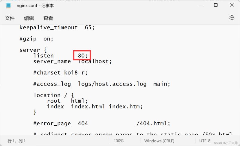 1、要知道自己使用的是哪一個端口。可以在文件路徑下找到nginx.conf這個文件,用記事本打開