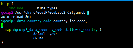 geoip2 /usr/share/GeoIP/GeoLite2-City.mmdb {auto_reload 5m;$geoip2_data_country_code country iso_code;}map $geoip2_data_country_code $allowed_country {default yes;CN no;}