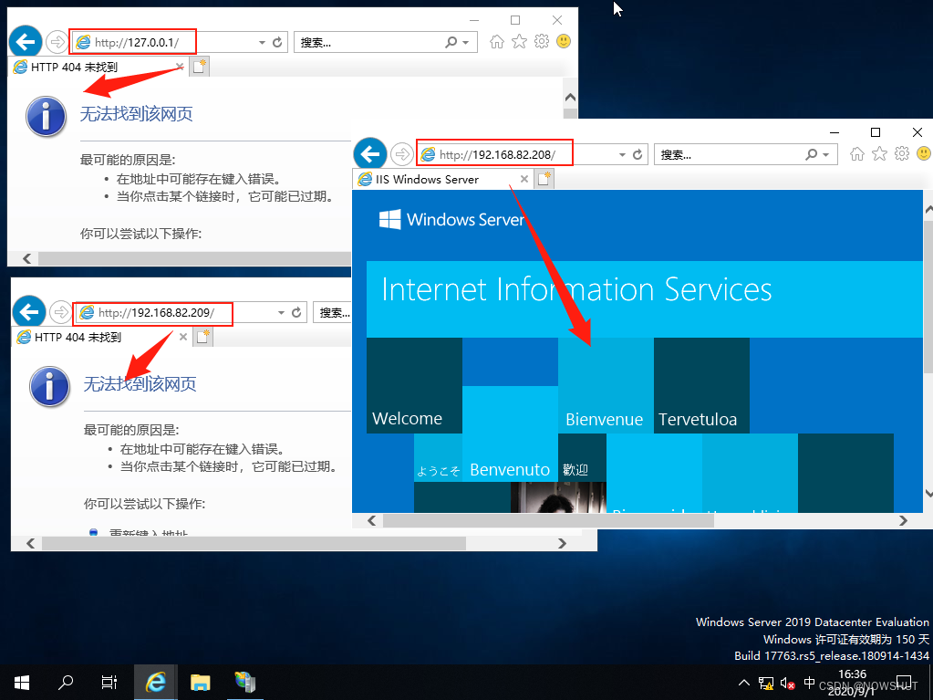 (7)驗證網站IP地址唯一性。打開IE瀏覽器,輸入http://192.168.82.209發現無法打開網頁,輸入其他地址也是如此。但是輸入http://192.168.82.208可以正常打開網站。