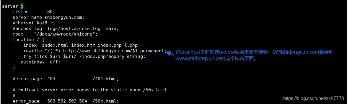 因為公司要求訪問 shidongyun.com的時候瀏覽器會自動跳轉到www.shidong.com下面,專業術語叫“301跳轉”百度了一番,nginx配置規則,用rewrite還有return進行重寫301跳轉。我這里用的是rewrite。