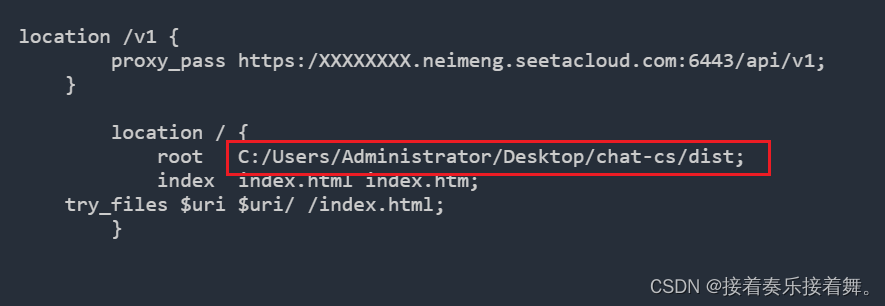 location ^~ /v1 {proxy_pass https://XXXXX.neimeng.seetacloud.com:6443/api/; }后來我是這么寫的(正確)