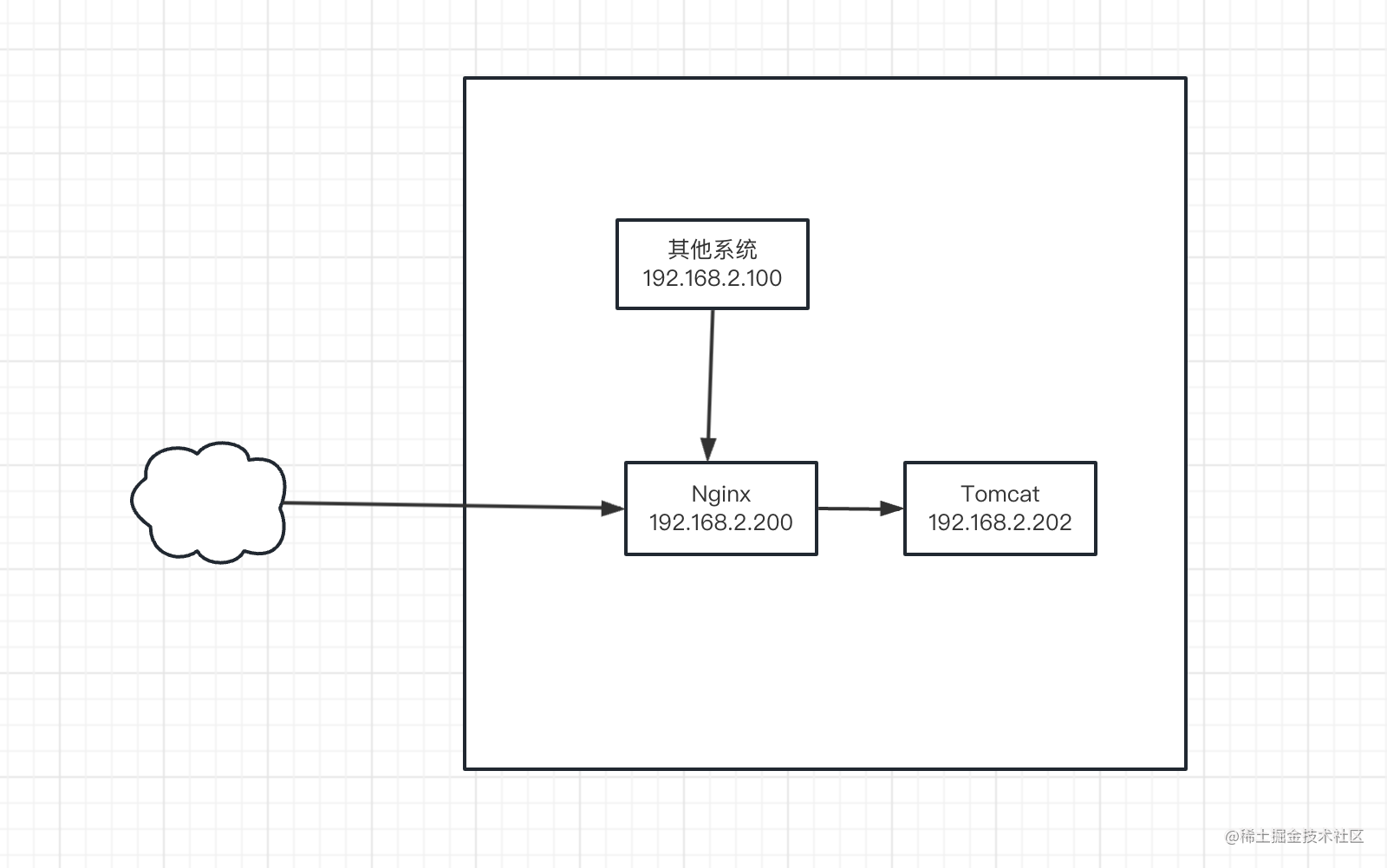 嘗試解決分析單體項目,系統部署架構很簡單,抽象一下如下圖所示: