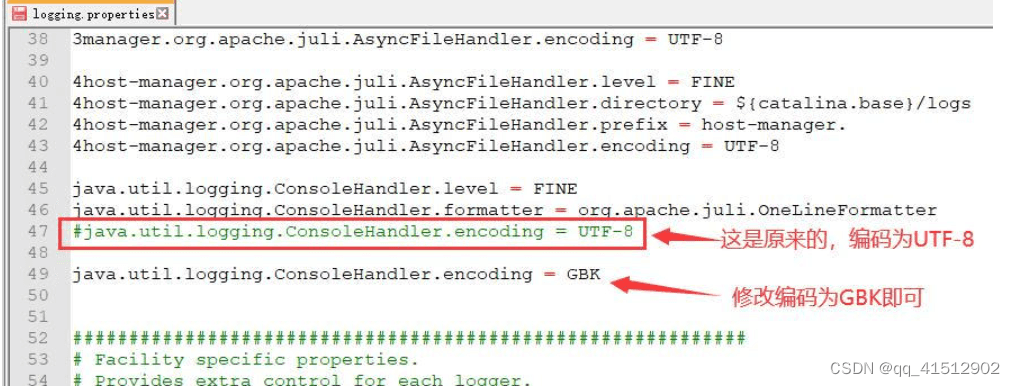 2.啟動(dòng)中文亂碼問題:?jiǎn)?dòng)Tomcat后,產(chǎn)生的日志有亂碼的情況出現(xiàn),不要慌,這并不影響你項(xiàng)目的正常運(yùn)行。這是由于編碼不一致引起的,Tomcat啟動(dòng)后默認(rèn)編碼UTF-8,而Windows的默認(rèn)編碼是GBK。因此你想讓其不亂碼,只需配置conf\logging.properties的編碼格式即可
