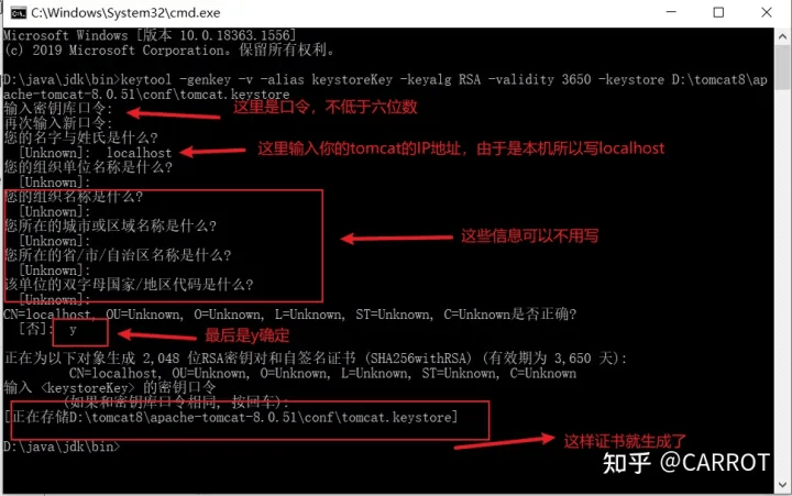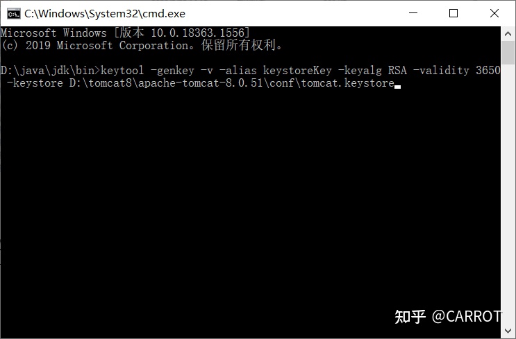 然后在窗口輸入這個命令:keytool -genkey -v -alias keystoreKey -keyalg RSA -validity 3650 -keystore D:\tomcat8\apache-tomcat-8.0.51\conf\tomcat.keystore