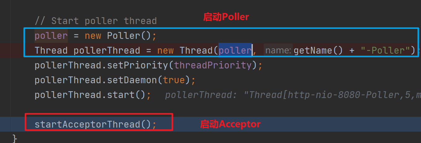 NioEndpoint#start方法最后會(huì)觸發(fā)Poller線程和Acceptor線程的啟動(dòng)