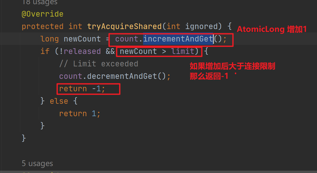 LimitLatch 內(nèi)部持有一個(gè)AbstractQueuedSynchronizer,限制連接數(shù)將調(diào)用其acquireSharedInterruptibly(1),然后會(huì)調(diào)用到AQS的tryAcquireShared,其內(nèi)部使用AtomicLong來(lái)進(jìn)行連接的計(jì)數(shù)。
