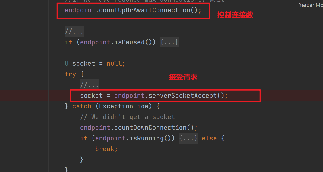 其內(nèi)部使用LimitLatch#countUpOrAwait方法限制連接數(shù),如果連接數(shù)達(dá)到了上限,那將掛起當(dāng)前線程,也就是掛起Acceptor線程,從而導(dǎo)致無(wú)法有更多的請(qǐng)求連接上來(lái),最大連接數(shù)默認(rèn)為8*1024。