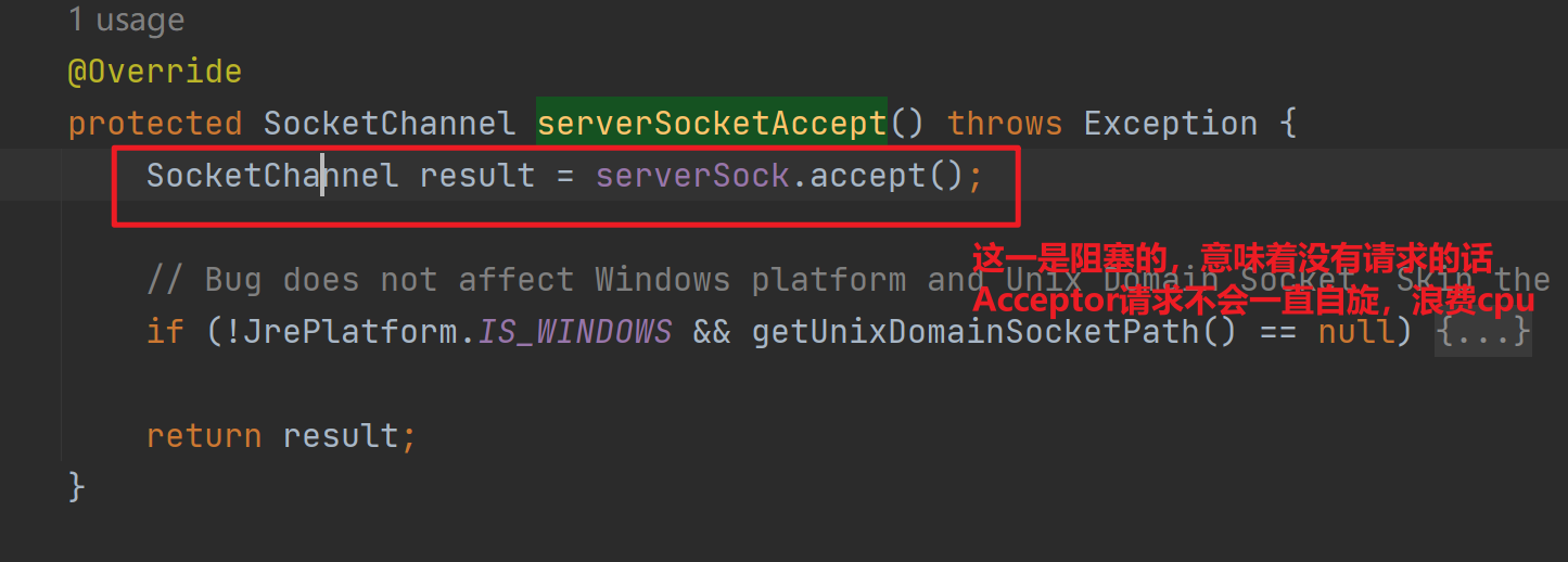 由于NioEndpoint前面調(diào)用了ServerSocketChannel#configureBlocking(true),所以serverSock#accept,在沒有連接上來(lái)時(shí),不會(huì)立馬返回null,而是阻塞直到連接來(lái)到。