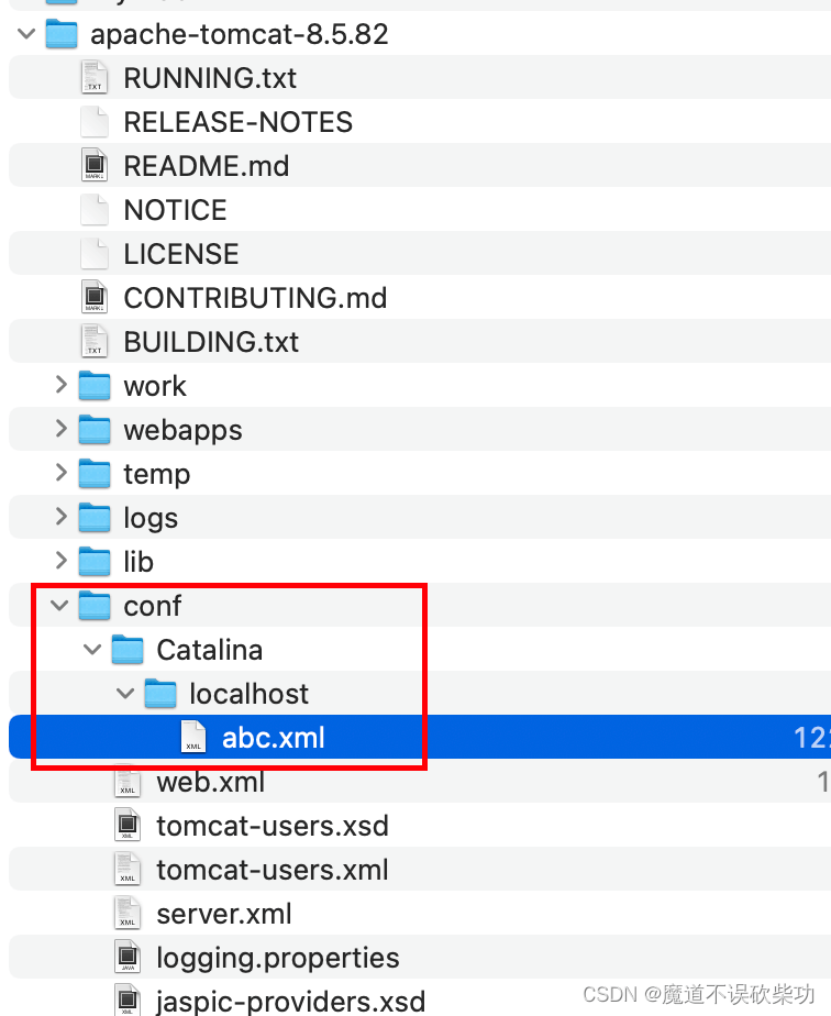 當(dāng)你運(yùn)行一次 Tomcat 之后,Tomcat 會自動在 conf 文件目錄下自動生成 /config/Catalina/localhost/ 目錄。然后你就可以在這個目錄下新建一個 xml 文件。xml 文件名稱就是你網(wǎng)站的訪問路徑。比如新建一個 abc.xml 文件,如下所示: