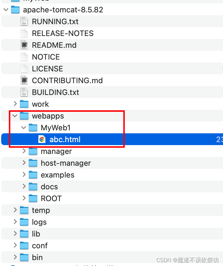 <Server port='8005' shutdown='SHUTDOWN'> <Service name='Catalina'> <Connector port='8080' protocol='HTTP/1.1' connectionTimeout='20000' redirectPort='8443' /> <Engine name='Catalina' defaultHost='localhost'> <Context path='/myWeb1' docBase='/Users/gwm/Downloads/MyWeb1' reloadable='true'> </Engine></Service></Server>appBase:相當(dāng)于是一個主機(jī)的根目錄 /,默認(rèn)名稱叫做 webappspath:在 webapps 主機(jī)下會有多個網(wǎng)站,可以通過 path 來進(jìn)行區(qū)分docBase:path 訪問網(wǎng)站文件具體目錄,比如上面的 abc.html 就在 /Users/gwm/Downloads/MyWeb1 文件目錄下。因為 docBase 可以指定網(wǎng)站資源文件位置,所以你就不用將網(wǎng)站再放到之前的 webapps 主機(jī)下面。所以最終訪問 abc.html 的路徑是:http://localhost:8080/myWeb1/abc.html。