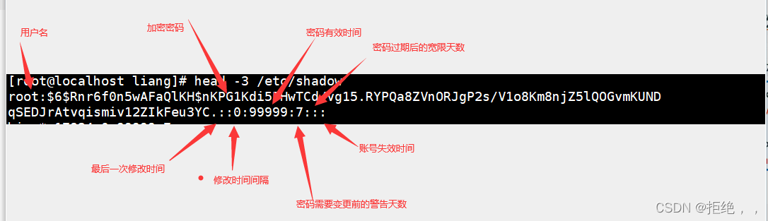 0:用戶(hù)賬號(hào)的UID號(hào)。0:所屬基本組賬號(hào)的GID號(hào)root:描述性信息,此字段只是用來(lái)解釋這個(gè)用戶(hù)的意義而已/root:宿主目錄,即該用戶(hù)登錄后所在的默認(rèn)工作目錄注:通常稱(chēng)為用戶(hù)的主(家)目錄。例如:root主目錄為/root,普通用戶(hù)odysee的主目錄為/home/ody see/bin/bash錄shell等信息,用戶(hù)完成登錄后使用的3.0 用戶(hù)賬號(hào)文件/etc/shadow作用:保存用戶(hù)的密碼,賬號(hào)有效期等信息